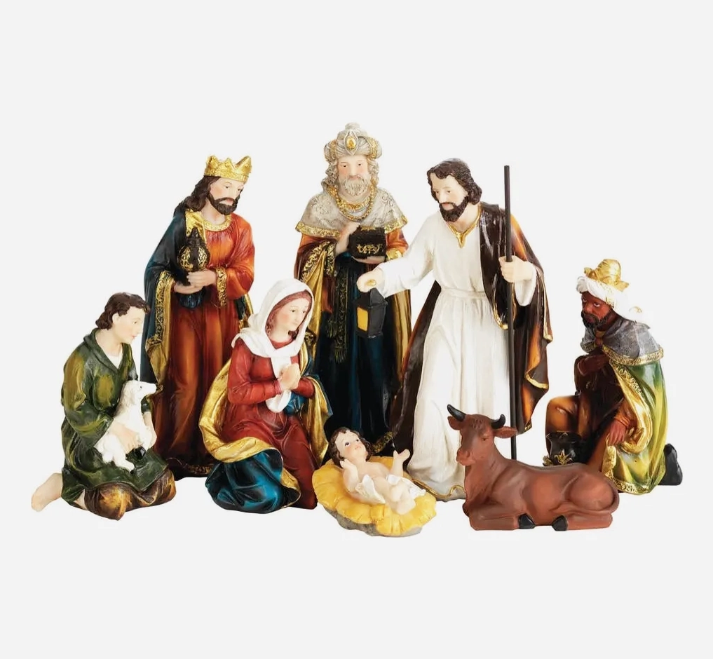 This traditional eight-piece nativity set is distinctive in the beautiful folds of the clothing, along with ornamental gold accents.