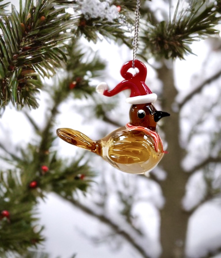 Expertly crafted from hand-blown glass, this delightful bird features warm amber tones, delicate detailing, and a dusting of white speckles for a wintry feel. Dressed in a bright red Santa hat and scarf, it brings cheerful holiday spirit and whimsical charm to your Christmas décor.