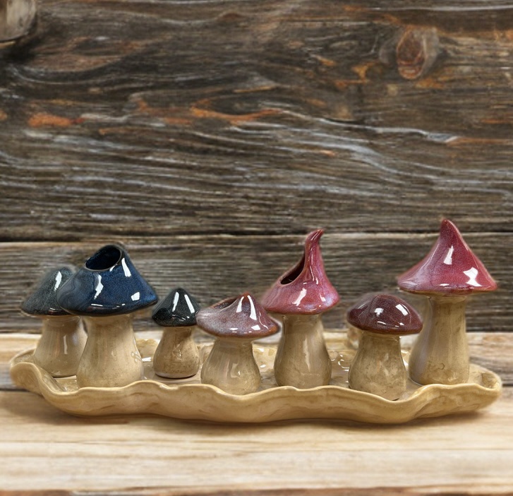 Add a touch of whimsical woodland charm to your home with this porcelain toadstool house decoration. Featuring a row of intricately detailed mushroom-shaped houses in soft earthy tones and glazed pastel caps, this delightful piece captures the magic of a fairy tale forest village.