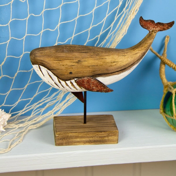 This charming rusty whale ornament on a stand brings a warm, rustic coastal feel to your home décor. Measuring 20cm, the piece features a beautifully crafted whale with a natural wood-effect body, complemented by distressed red accents on the fins and tail for a weathered, seaside look.